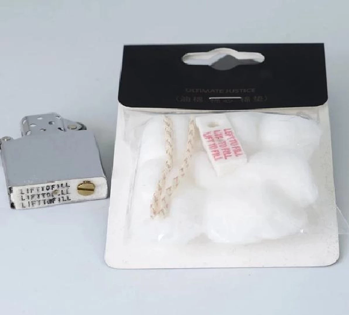 een setje bestaande uit katoen, lont en afsluiter voor bijvoorbeeld een zippo benzineaansteker.
