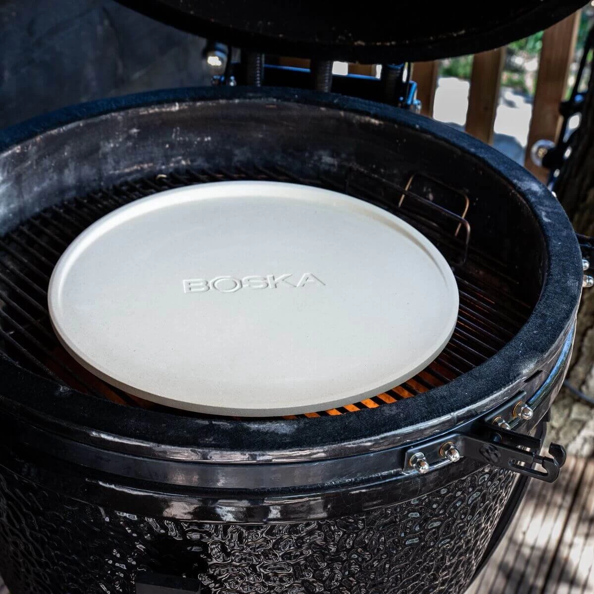 Deze pizzasteen is extra dik. Dit maakt hem geschikt voor gebruik op de barbecue of in de oven. De opstaande rand aan de achterkant voorkomt dat je pizza’s per ongeluk van de steen af schuift. De pizzasteen mag nooit in de vaatwasser. Was hem ook niet met de hand af; de steen absorbeert water, waardoor hij bij een volgend gebruik kan breken. Je maakt de steen eenvoudig schoon door er een droge keukendoek overheen te halen. Achtergebleven pizzaresten verwijder je met een hard plastic of houten spatel. Je krijgt standaard 10 jaar garantie op de BOSKA Pizzasteen Deluxe.