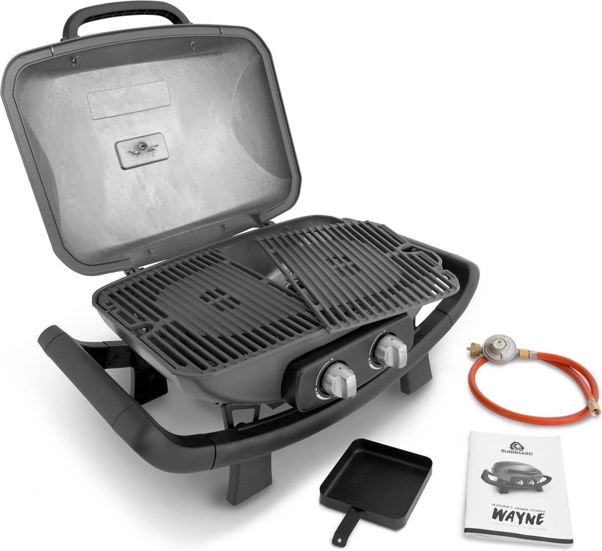 Barbecue er rustig op los tot maximaal 300 °CWAYNE grilt vlees, vis en groente met in totaal 3,5 kW en temperaturen tot maximaal 300 °C goed gaar. Ontsteek hiervoor de beide roestvrij stalen branders met de piëzo-ontsteking en controleer de 2 grillzones naar behoefte met de traploze regeling.