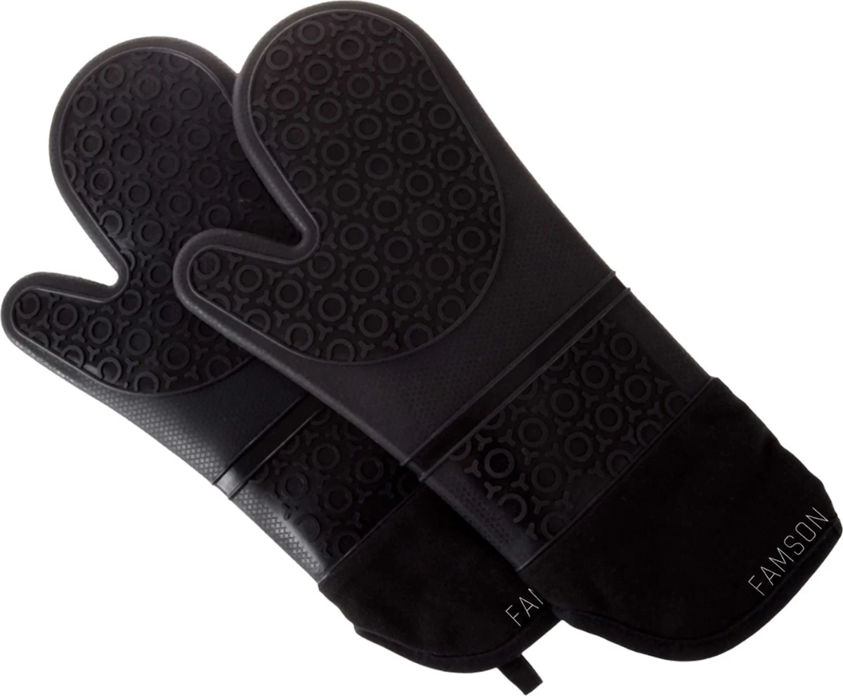 food-grade siliconen en zijn vlekbestendig en zeer gemakkelijk schoon te maken met warm water en een beetje zeep. De ovenhandschoenen van Famson zullen na een goeie schoonmaak niet scheuren of rafelen.