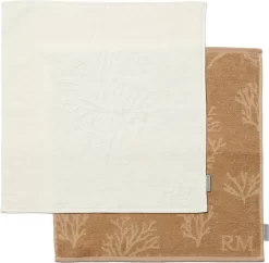 De RM Coral Reef Kitchen Towel 2 pcs is een set die bestaat uit twee verschillende keukenhanddoeken. Het witte exemplaar is versierd met een groot koraal en de lichtbruine handdoek heeft een patroon van kleine koralen en de letters ‘RM’. Het keukentextiel is gemaakt van een hoge kwaliteit katoen dat extreem zacht aanvoelt. Bekijk ook de bijpassende theedoeken!