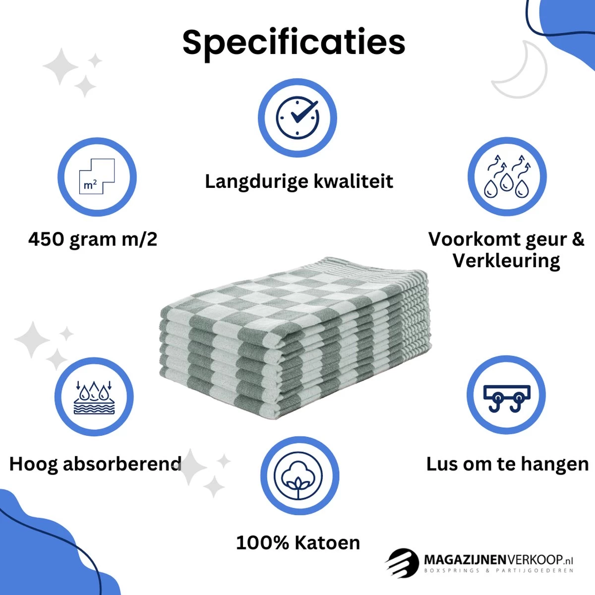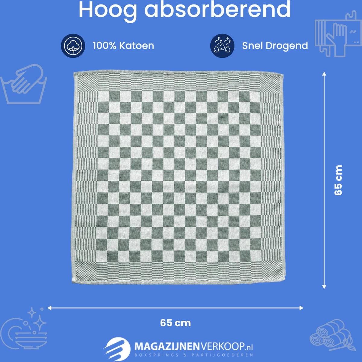 HORECAKWALITEIT – 100% KATOEN – SNELDROGEND – GEBLOKT De theedoeken zijn van 100% Katoen en hebben een afmeting van 65×65. De theedoeken zijn sneldrogend, hebben een hoog absorberend vermogen en zijn zeer stevig. Door het gebruik van een hoge kwaliteit katoen gaan de theedoeken voor lange tijd mee. Extra specificaties: Snel drogend Hoog absorberend vermogen 100% Katoen 450gram m/2 Afmeting: 65×65 Kleur: Wit en blauw geblokt Lus om de theedoek op de hangen Set van 12 stuks Gebruiken voor: Drogen Schoonmaken Pannenlap Schort Sloof Servet