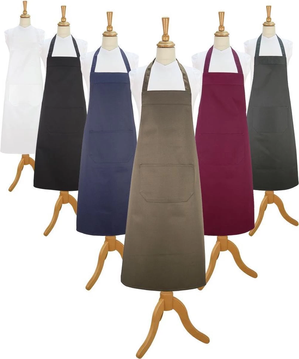 Stijlvolle schorten verkrijgbaar in 6 kleuren: wit, zwart, antraciet, donker blauw, donker rood en bruin. Er zijn 2 afmetingen in deze serie: 100x100cm (sloven tot op de enkels) + 70x100cm (halterschort met brede zak).